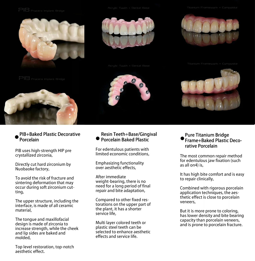 The most common repair method for edentulous fixed restorations (such as all on4) has high bite comfort and is easy to repair clinically. With rigorous porcelain application techniques, the aesthetic effect is similar to porcelain veneers, but it is prone to discoloration, lower density, and bite bearing capacity compared to porcelain veneers, and is prone to porcelain fracture.
