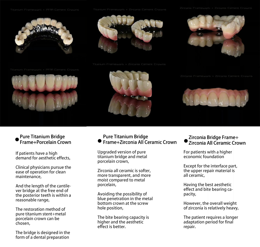 The upgraded version of pure titanium bridge and metal porcelain crown, zirconia all ceramic is softer, more transparent, and more moist compared to metal porcelain, avoiding the possibility of blue penetration in the screw hole position of the metal bottom crown. It has higher bite bearing capacity and better aesthetic effect.